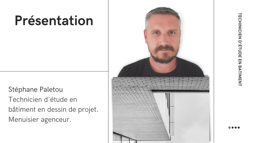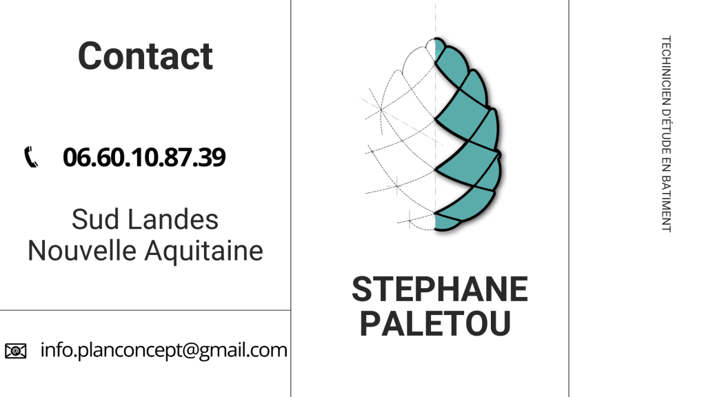 Stephane Paletou ,technicien d’études du bâtiment en dessin de projet, dessinateur projeteur, études de PLU, réalisation d’esquisse de permis de construire ainsi que des plans d’exécutions. Nous réalisons le relevé d’état des lieux. Nous travaillons sur Archicad, sketchup, autocad. Spécialise dans le domaine du bois (ossature, charpente, aménagement de terrasse, pergolas, …).